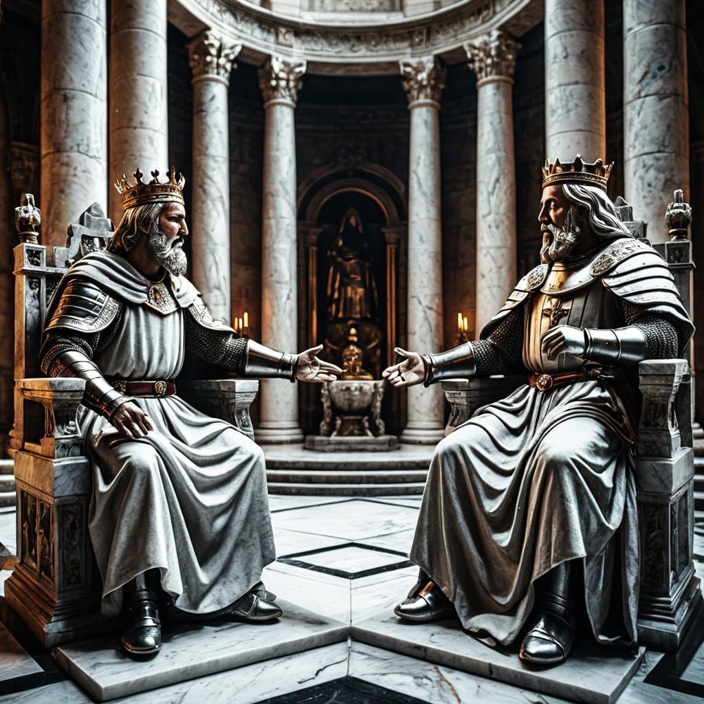 A heated debate between two Mesopotamian gods, marble statues, Detailed, ziggurat temple background, wide angle, close up, photorealistic, octane render, art style by Oliver Barrett + Simon Dominic + Ilya Repin, volumetric lighting, hdr.