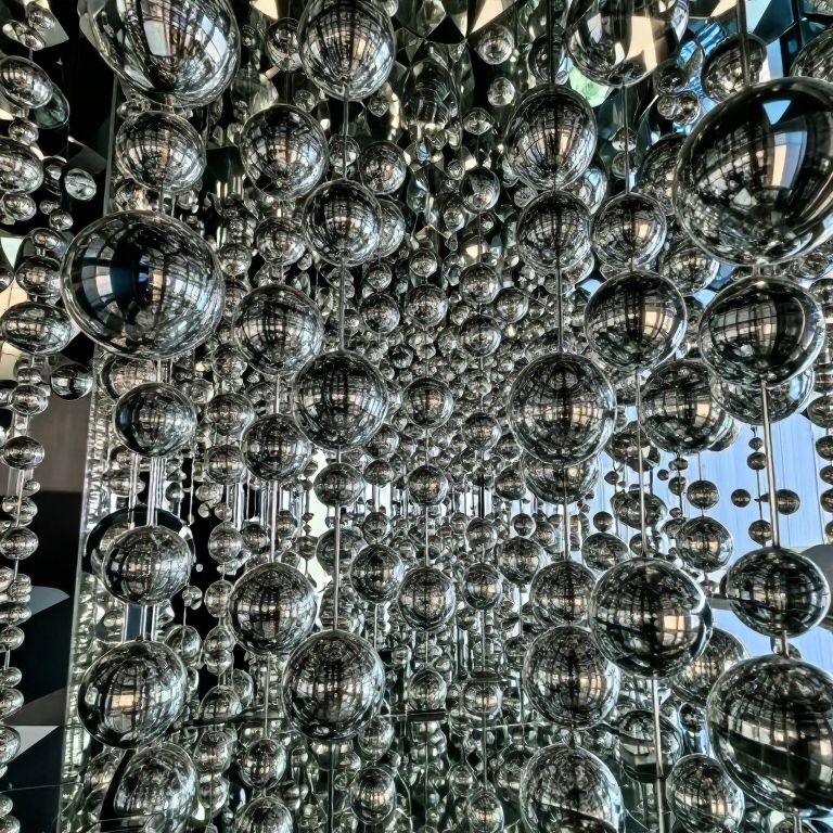 Photograph of numerous silver, reflective, spherical mirrors hanging densely in a grid pattern, creating a shimmering, kaleidoscopic ceiling display.