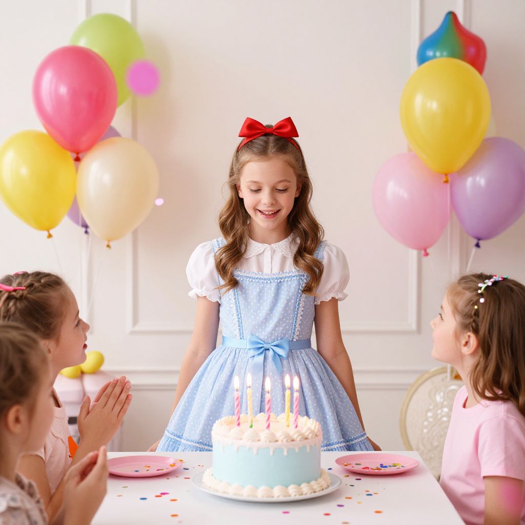 Dorothy Gale 10 year old birthday party, children, confetti, bright colours, balloons, cake, candles, fun and happy, hyperrealism, very detailed, photorealistic, 4k,