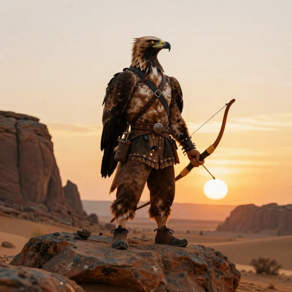 Realistic photo.An anthropomorphic eagle hunter standing heroically on a rock holding a bow in her hand. Adventurous, set in a desert with rocky outcrops and a setting sun. Ethereal, stunning and bold, exuding courage. Inspired by the styles of Stanley Artgerm Lau, Sakimichan, and WLOP. D&D fantasy art, trending on ArtStation, digital art. realistic photo