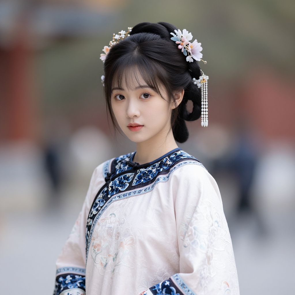 "chinese traditional costume, 1girl, solo, hair ornament, blurry background, blurry, outdoors, looking at viewer, flower, hair flower, realistic, chinese clothes, standing, asian Realistic photo of casual sexy person with pretty face"