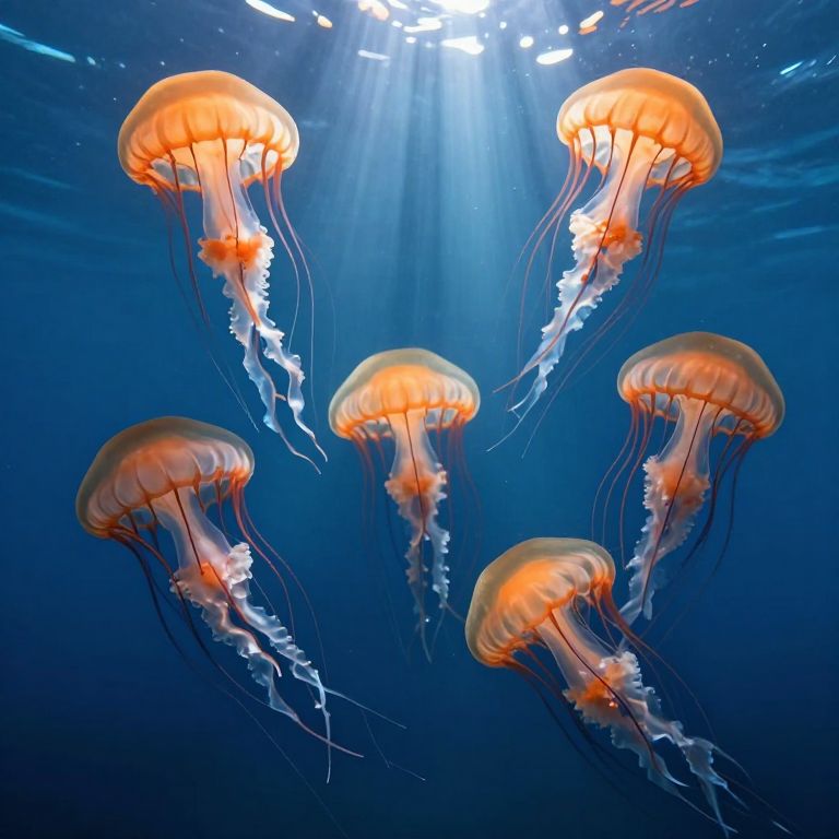 Five translucent jellyfish gracefully drift through the deep blue ocean, their vibrant orange bell-shaped bodies illuminated by sunlight streaming down from above, creating ethereal trails of light and shadow as they float serenely amidst the depths.