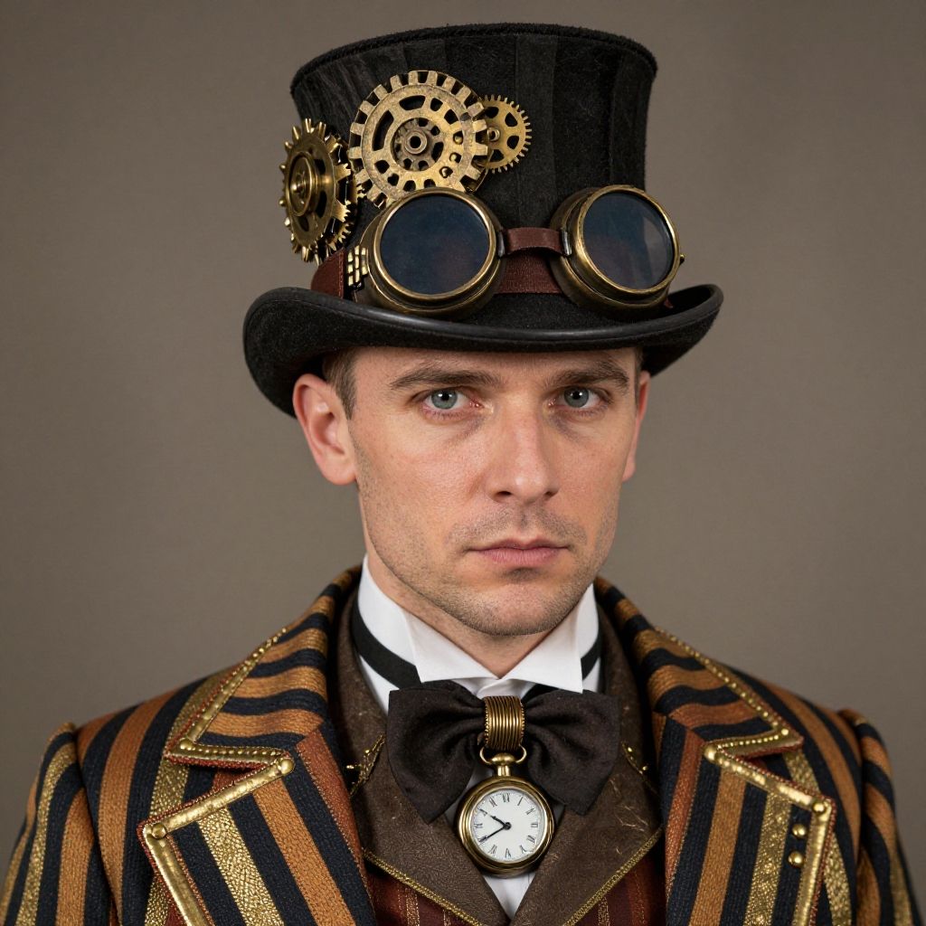 A man in a detailed steampunk Halloween costume poses for a photorealistic close-up headshot, featuring a top hat adorned with brass gears and goggles. His vintage-inspired outfit includes a striped coat with gold accents and a pocket watch, evoking the classic steampunk aesthetic.