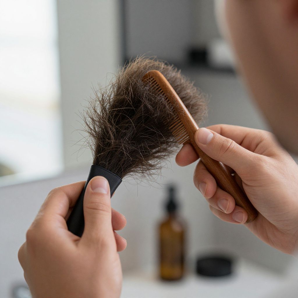Close-up photograph of a man's hands using a brown wooden comb with a black handle to detangle thick, dark hair in a modern, white bathroom