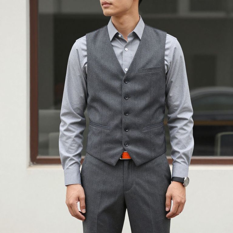 Photograph of a young Asian man standing outdoors, cropped from the chest to mid-thigh. He wears a light blue dress shirt with a dark gray, textured, three-button vest and matching trousers. The vest has subtle vertical stitching and a small pocket on the left side. He has a slim build and a neutral expression, with short black hair. A black wristwatch is visible on his left wrist. The background is blurred, showing a dark window and a hint of a car. The lighting is bright, emphasizing the contrast between the light shirt and dark vest.