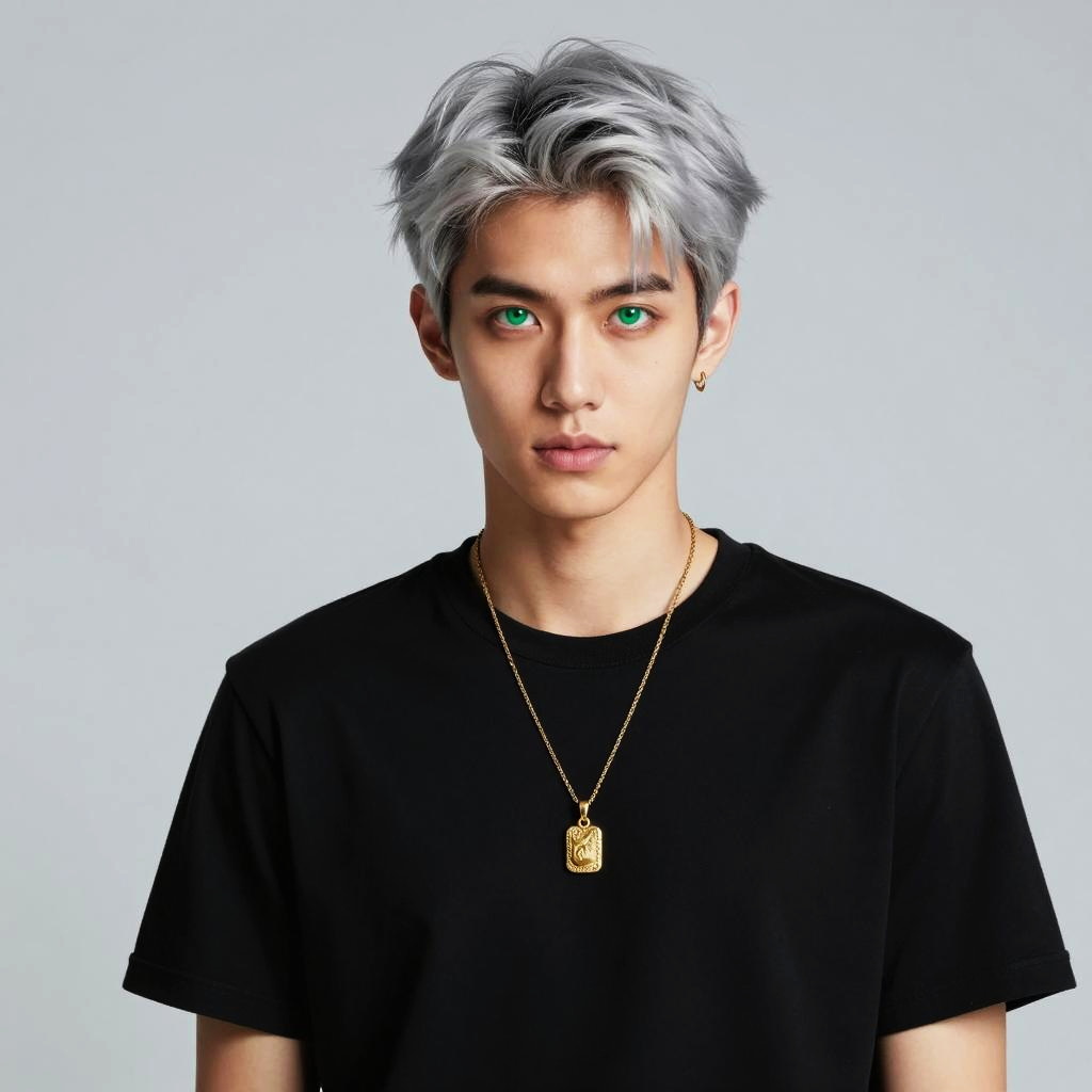 A young man with striking silver-gray hair and green eyes stares directly into the camera against a plain gray background. He wears a simple black t-shirt and a gold pendant necklace, presenting a modern and minimalist style portrait.