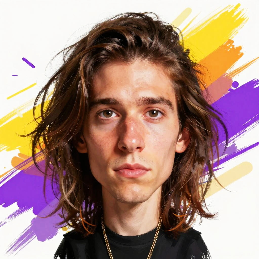 Digital caricature of a young male musician with wild, shoulder-length brown hair and expressive hazel eyes. The image features accentuated facial features such as the nose and mouth, set against a lively background with dynamic brush strokes in electric purple, orange, and yellow colors. The subject wears a black shirt and a gold chain, rendered in a modern digital cartoon style.