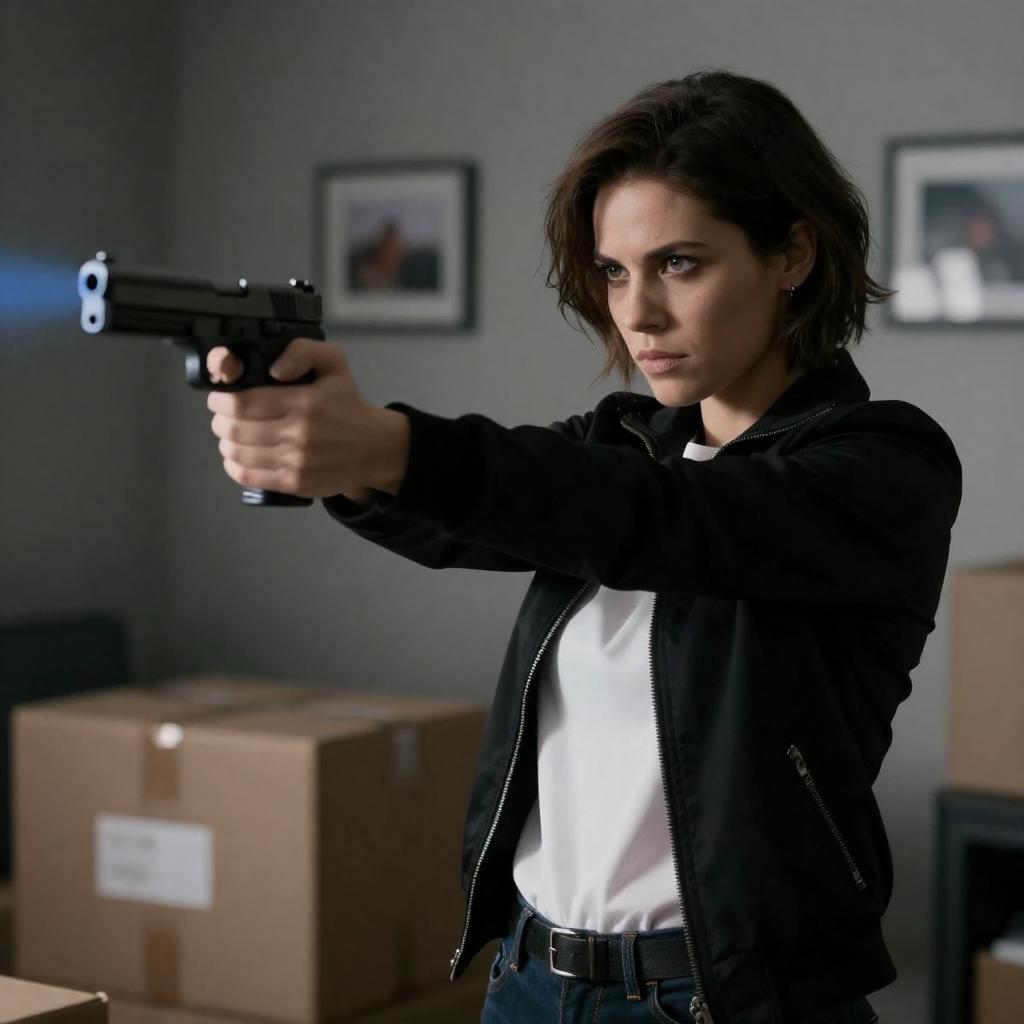Photograph of a woman with short, curly dark hair, wearing a black coat, holding a black handgun pointed upward. She stands against a ured, gray concrete wall, looking to the side with a serious expression. The lighting is cool-toned, highlighting her determined gaze and the gun's sleek design.