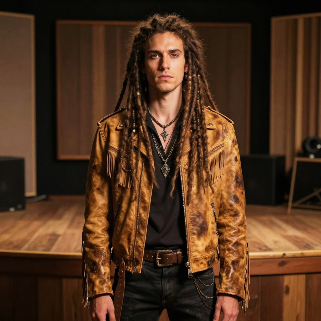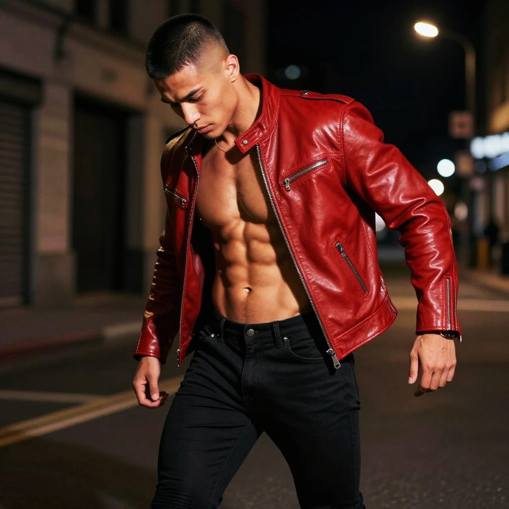 Vibrant street poet, colorful pastel pink bob cut, muscular build, leather jacket outfit, bright yellow distressed leather jacket, urban artsy, mural filled outdoor wall studio background