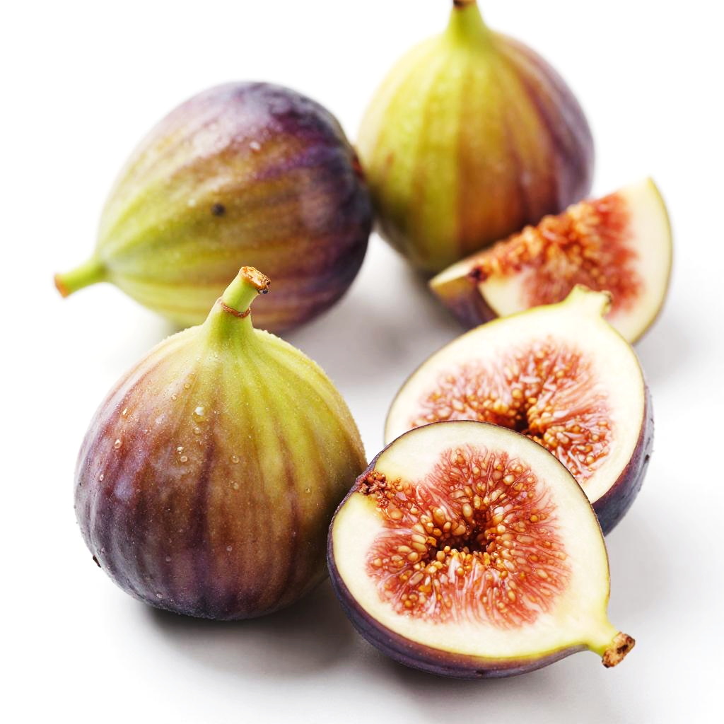 Photograph of fresh figs against a white background. In the foreground, there are three figs: one whole greenish-purple fig, and two halves showcasing the pinkish, seed-filled interior. In the blurred background, more whole figs are scattered, creating a sense of depth. The figs have a slightly glossy texture, with green and purple hues blending beautifully.