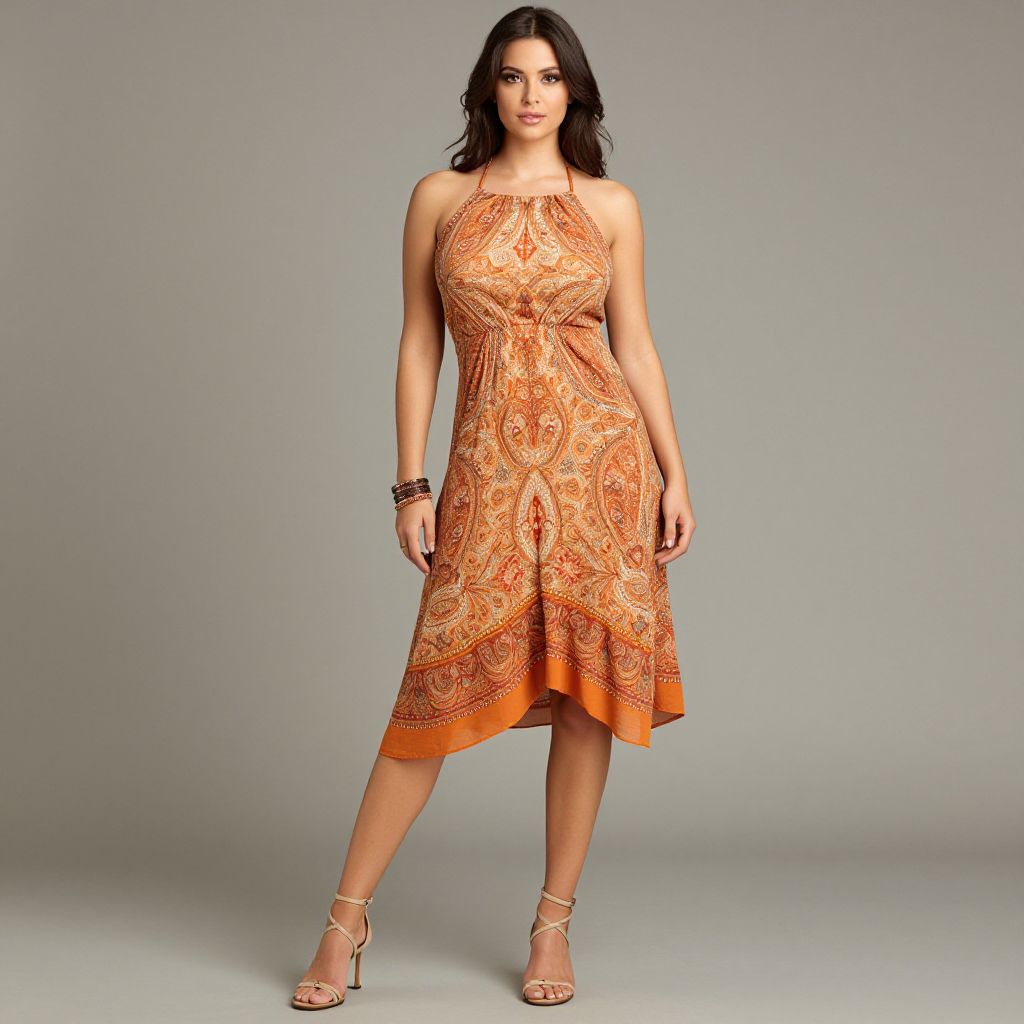"Woman, summer clothing, paisley print halter neck dress in warm orange tones, knee-length with a handkerchief hem, sleeveless, paired with neutral strappy sandals, accessorized with bangle bracelets.. Sexy. Pretty face and beаutiful eyes. Big breasts."