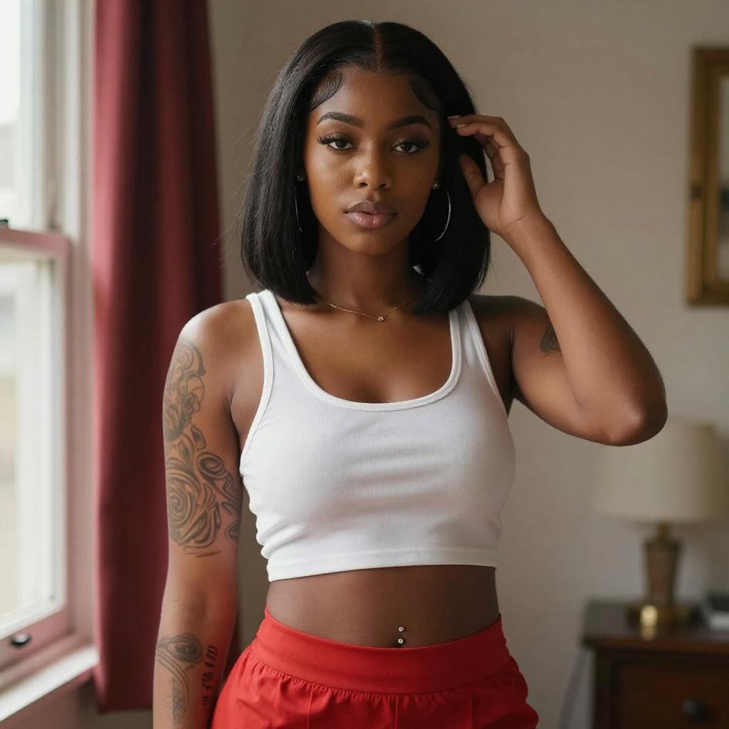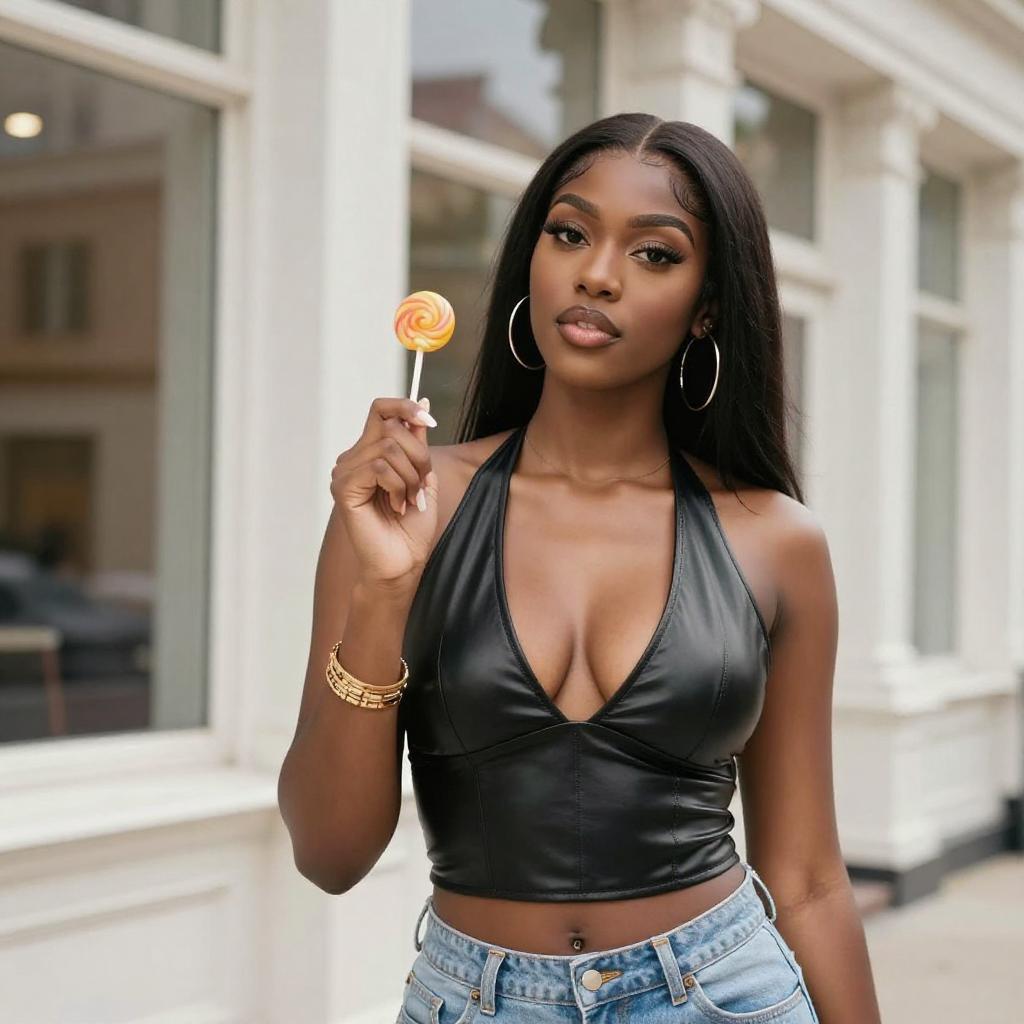 Photograph of a young Black woman with long, wavy black hair, wearing an orange, button-up crop top that accentuates her medium-sized breasts, and light blue jeans. She stands confidently in front of a curved, stone wall with ornate detailing, looking directly at the camera with a slight smile. The background includes a stone building with a large, barred window.