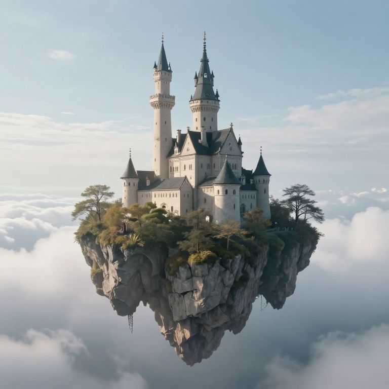 Suspended between heaven and earth, this ethereal castle perched atop a floating isle exudes a serene yet otherworldly allure, inviting contemplation of freedom, transcendence, and the timeless beauty of solitude.