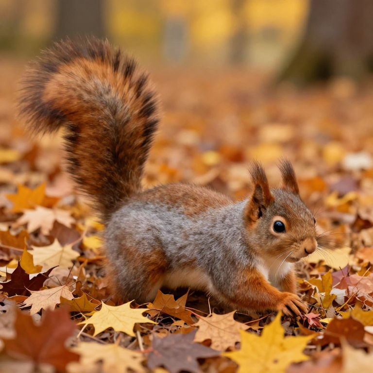 Photograph of a fluffy, brown and gray squirrel with a bushy tail, standing on an autumn forest floor covered in colorful fallen leaves.