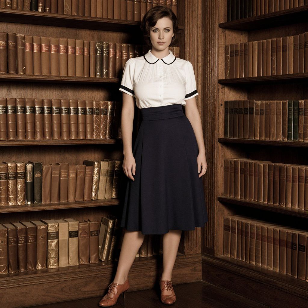 Photograph of a young woman standing in a dimly lit library with wooden shelves filled with brown leather-bound books. She has fair skin, dark brown hair styled in a short, side-swept bob, and wears a white short-sleeved blouse with black trim on the collar and sleeves, paired with a high-waisted, knee-length black skirt. She completes the outfit with brown leather loafers. The woman stands with a neutral expression, arms relaxed by her sides. The library's warm, brown wooden shelves and books create a rich, classic backdrop. The lighting casts soft shadows, enhancing the vintage atmosphere.