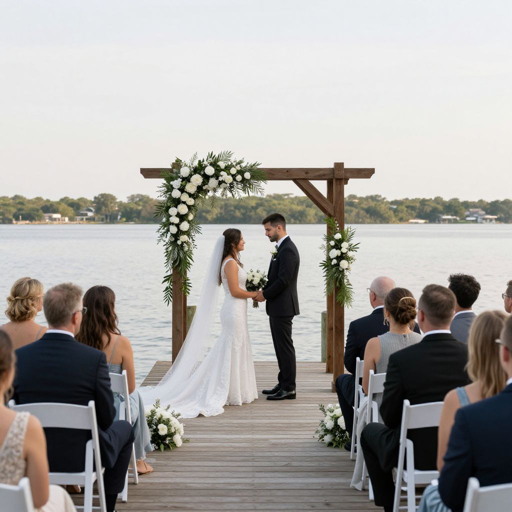 Photograph of an outdoor waterfront wedding ceremony. The bride, in a white, strapless, lace gown and veil, holds a bouquet of white flowers, stands facing the groom. He wears a black suit and tie. They stand beneath a wooden arch adorned with white and green floral arrangements. Guests, dressed in formal attire, sit on white chairs on both sides of a wooden dock. The background features a calm lake with green trees and a clear sky. The image captures a romantic and serene atmosphere.