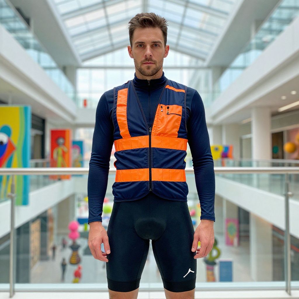 A man, fitted long-sleeve base layer, durable water-resistant jogger pants, padded cycling shorts, high-visibility cycling vest, navy blue with bright orange details, modern glass atrium, vibrant art installations, oversaturated film, focused expression Man has masculine face and piercing eyes