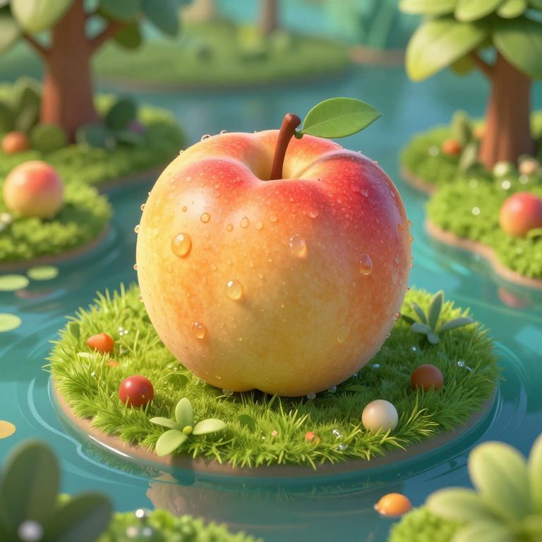 A vibrant CGI illustration depicts a large, juicy, peach-colored apple with dewdrops on its surface, centered on a lush, green grassy island in a sparkling blue pond. The apple, with a small brown stem and a single green leaf, is surrounded by tiny red and white berries. In the blurred background, two tree trunks and additional grassy islands with more apples and berries are visible, creating a whimsical, enchanted forest scene. The light is bright and sunny, enhancing the fresh and lively colors.