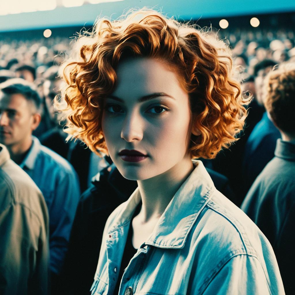 Close-up portrait of a woman with short, curly ginger hair wearing a light denim jacket standing in a crowded outdoor setting. The image features dynamic, gradient lighting with a blue, brown, blonde cream, and white color palette, creating a grunge aesthetic.