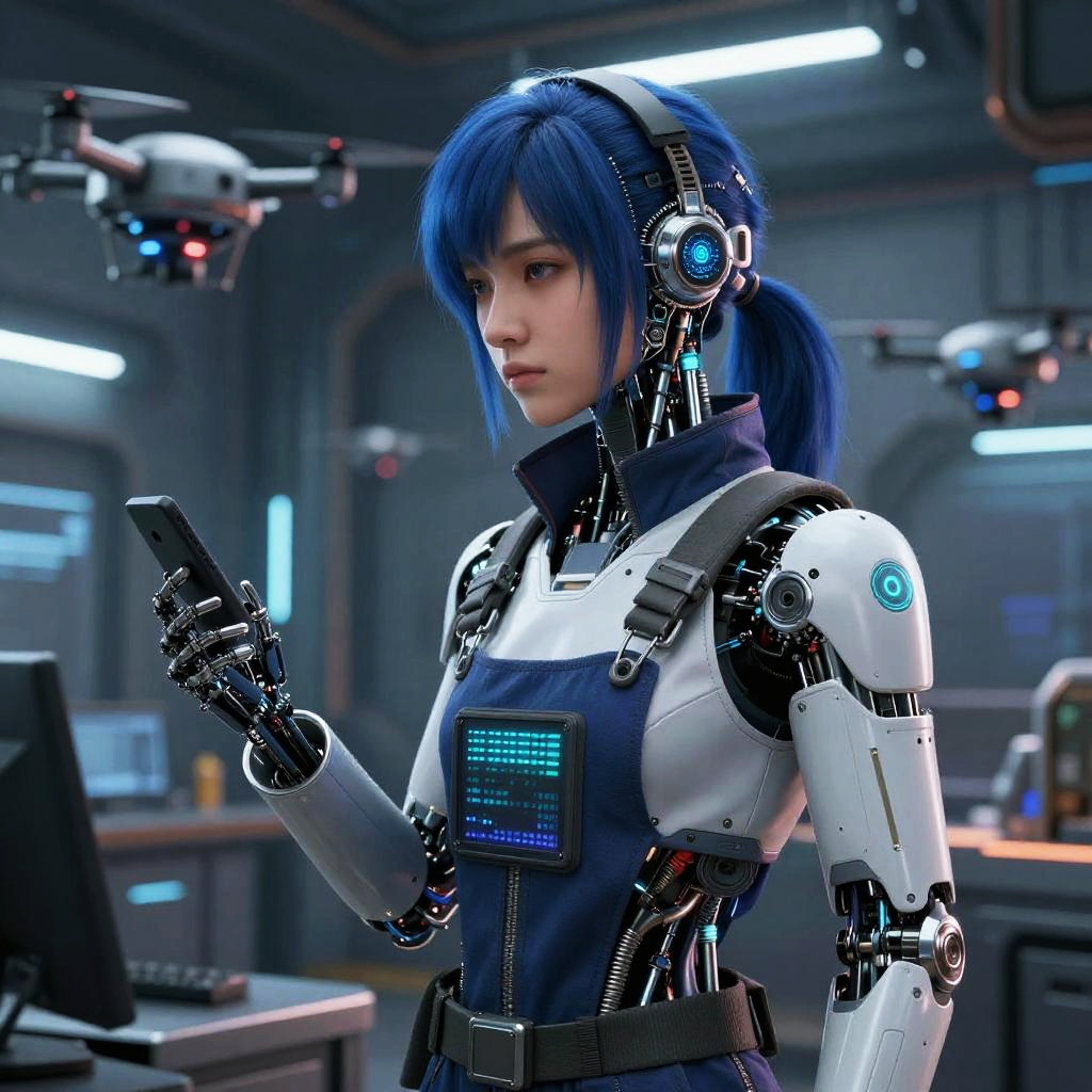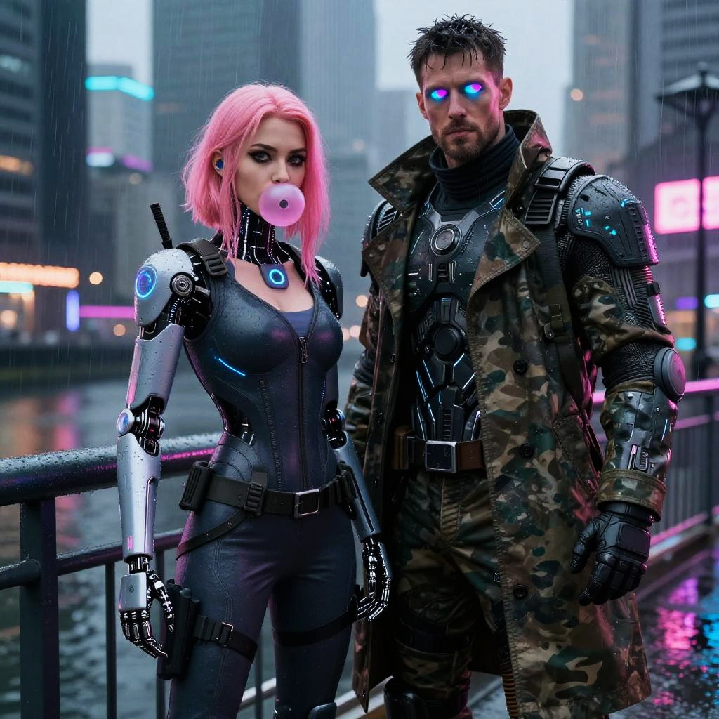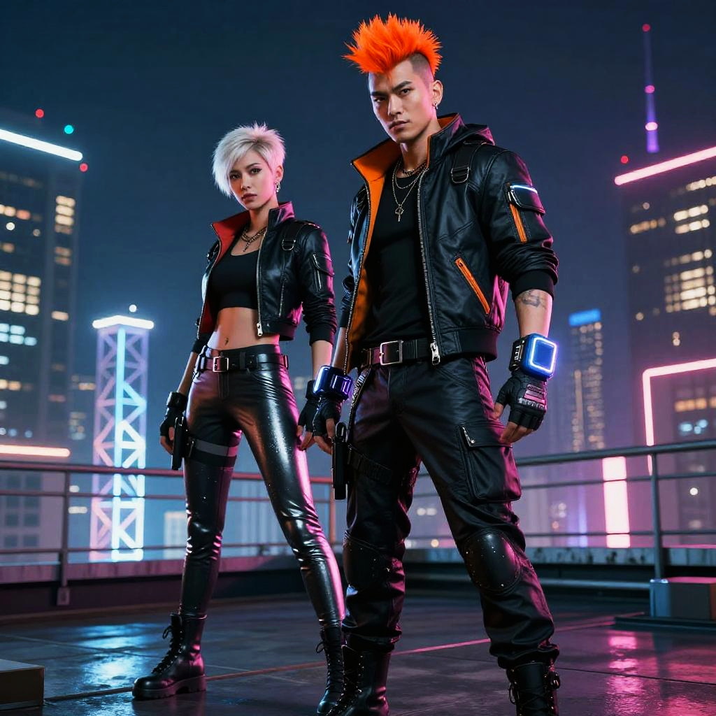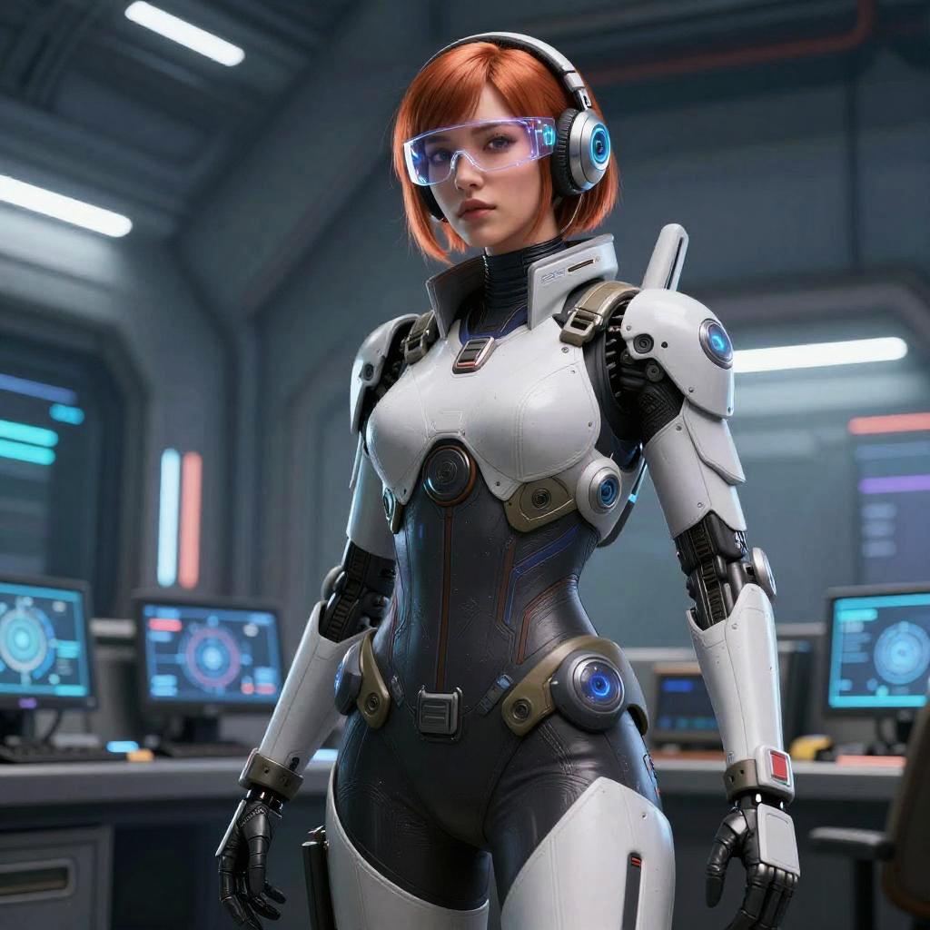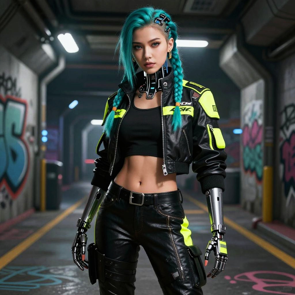 A cyberpunk scene featuring a petite female street racer with teal braided hair and cybernetic implants, set in a graffiti-sprayed futuristic underground tunnel, wearing neon-accented racing jacket and aerodynamic pants, hyper-realistic, ray tracing, dynamic lighting, high detail