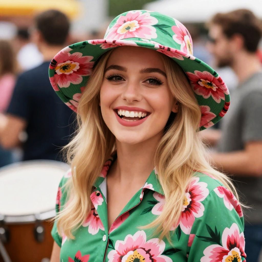 Blonde woman with fair skin, smiling widely, wearing a large pink and green floral hat, and a matching floral shirt. Dark brown eyes, light makeup, and pink lipstick. Drum in the background, partially visible. Multiple people blurred in background. Bright, cheerful atmosphere.