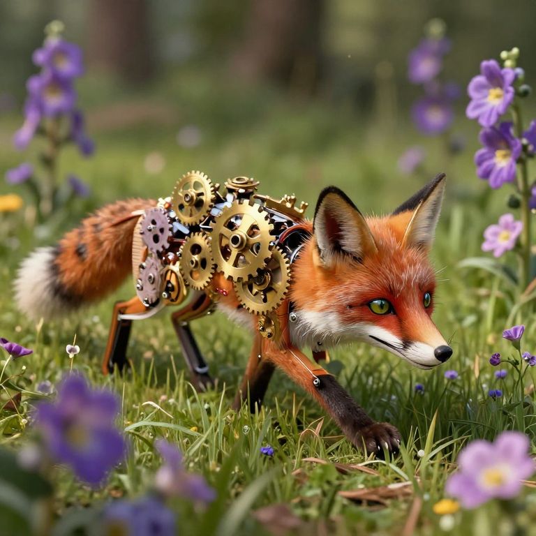 A digital illustration of a red fox with vibrant orange fur and a white-tipped tail, adorned with a cloak of interlocking golden gears and black spots. The fox is in a lush, green meadow filled with purple and yellow flowers, its green eyes focused intently forward. The background is a soft, blurred forest, enhancing the fox's detailed, realistic appearance. The fox's fur is textured, contrasting with the smooth, metallic gears on its back. The artwork blends realistic animal detailing with fantastical elements, creating a whimsical, enchanting scene.