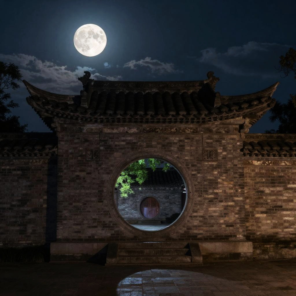 BJ_Ancient_city, sitting, sky, cloud, water, tree, no_humans, night, moon, night_sky, scenery, full_moon, architecture, east_asian_architecture, round_window, cinematic lighting, strong contrast, high level of detail, Best quality, masterpiece