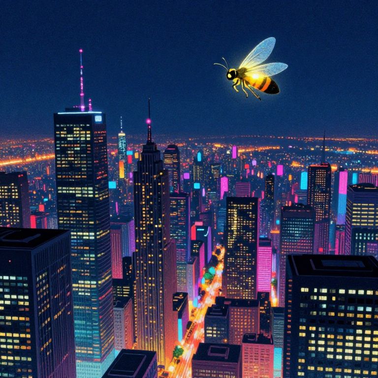 Neon-lit cityscape at night with towering skyscrapers, colorful lights, and a glowing, oversized bee with translucent wings flying above. Digital
