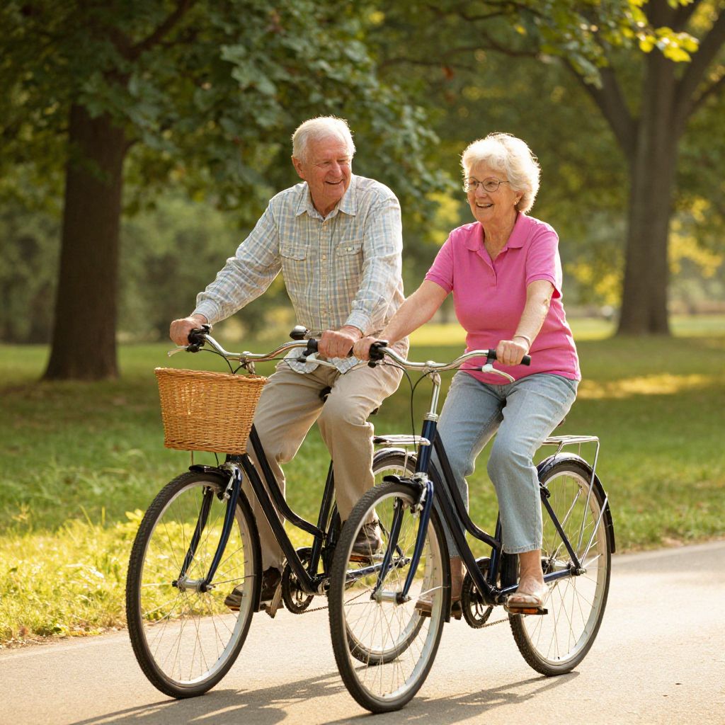 Golden sunlight bathes an elderly couple as they joyfully ride a tandem bicycle through a serene park, with the man guiding from behind and the woman steering ahead, both sharing a warm smile.