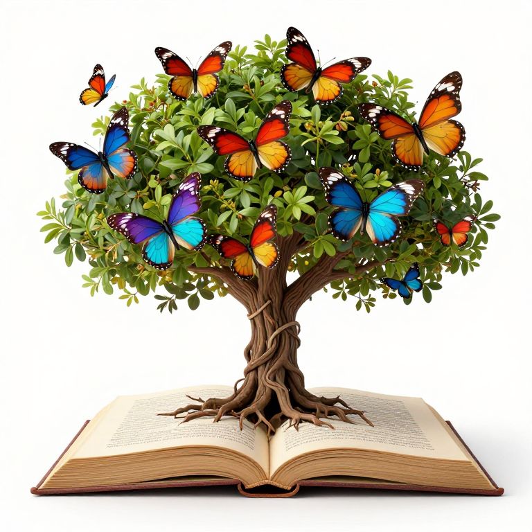 Roots of knowledge sprout from an open book, anchoring a tree of wisdom in the depths of imagination, as vibrant butterflies dance between the realms of thought and wonder, embodying the boundless freedom of the mind.