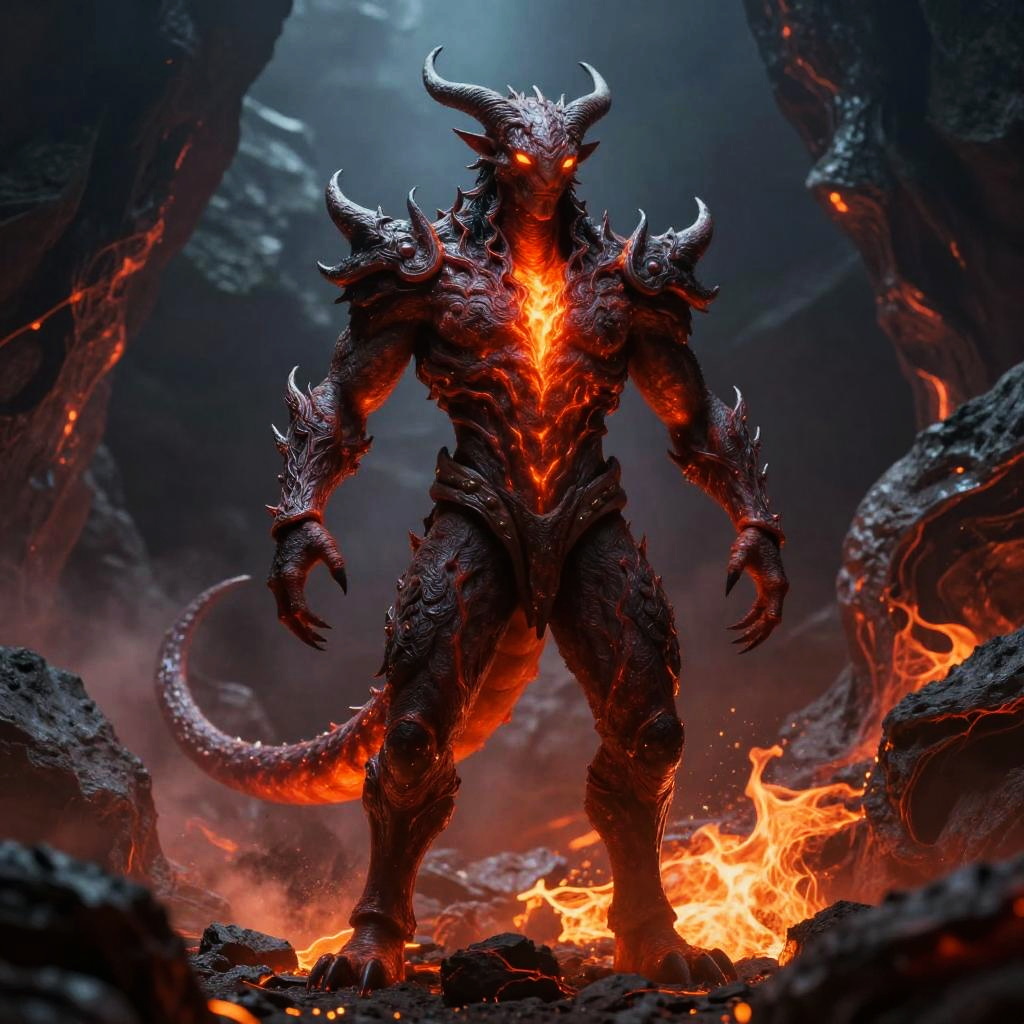 Digital artwork of a fiery, horned demon with glowing orange eyes and armor-like black scales standing amidst a volcanic landscape.