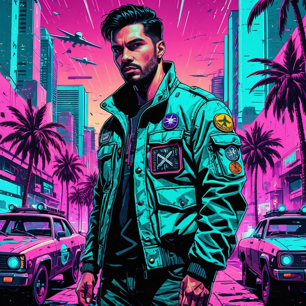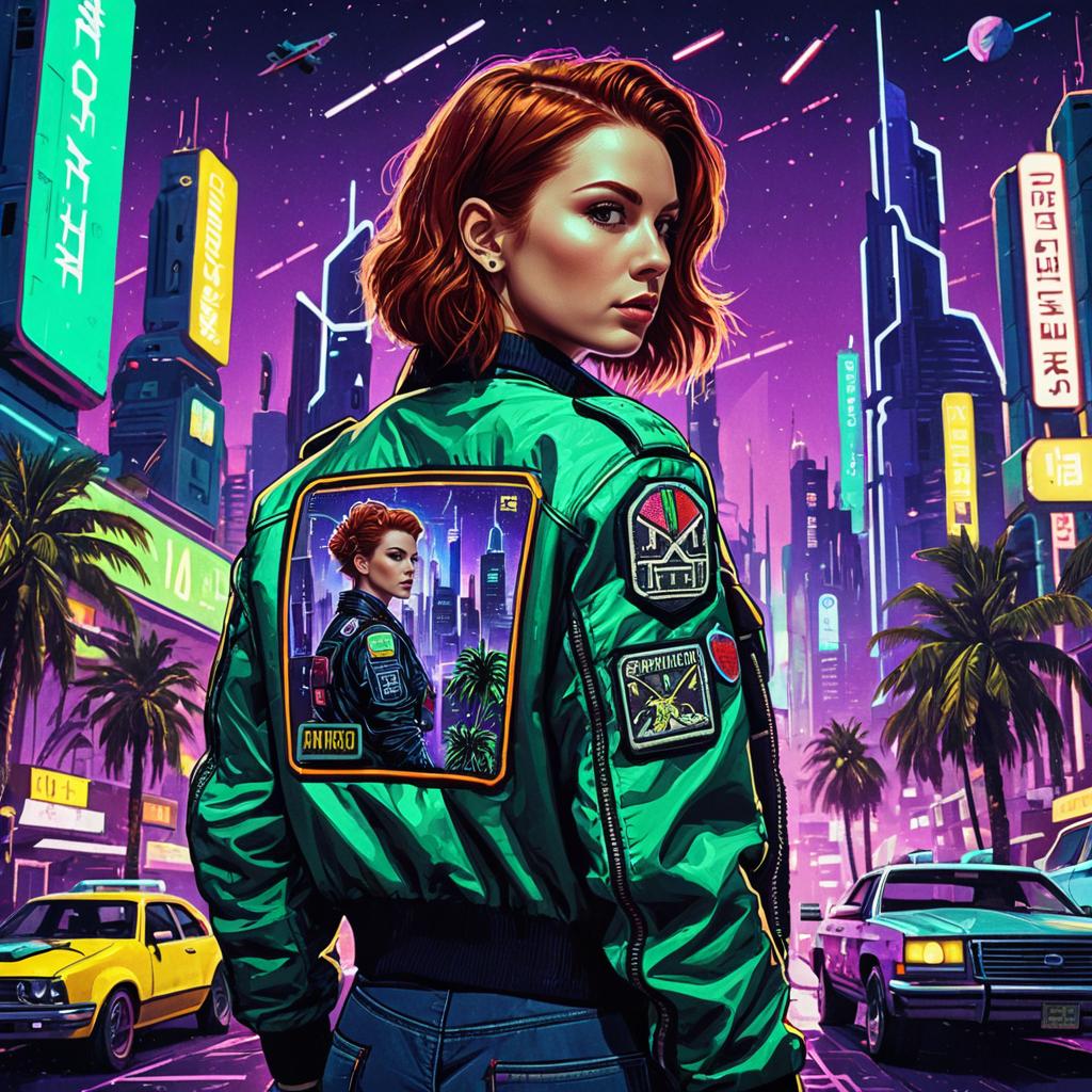 Retro-futuristic illustration of a determined android with auburn hair, wearing a rugged bombers jacket adorned with patches and insignia. Background features a vibrant, dual-tone lime green and violet cityscape with futuristic buildings, vehicles, and palm trees, evoking a cyberpunk, dystopian atmosphere with neon lighting and gritty details.