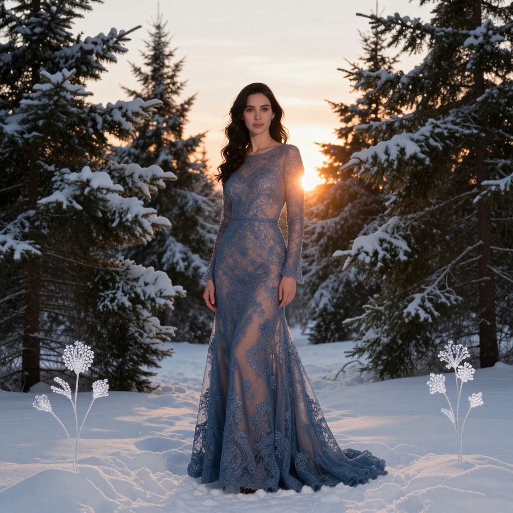Photograph of a woman standing in a snowy forest at sunset, wearing a long, sheer, blue lace gown with intricate patterns and long sleeves. Her dark hair is wavy, and she has a fair complexion. The sun sets behind her, casting a warm glow. Snow-covered evergreen trees surround her, and there are glowing white floral decorations in the snow in the foreground.