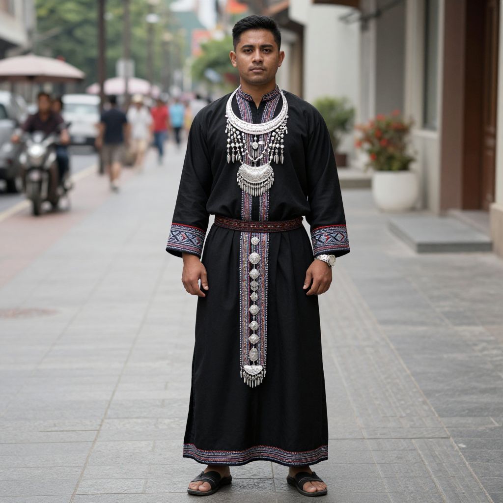 Photograph of a young Asian man standing on a city sidewalk. He wears a long, black traditional Bajau dress adorned with intricate white beadwork and silver embellishments along the neckline, sleeves, and down the center. He has short black hair, a medium build, and a neutral expression. His feet are in dark brown sandals. The background shows a blurred urban street scene with pedestrians, parked scooters, and buildings with white and brown facades. The sidewalk is paved with gray tiles, and a large potted plant with red flowers is visible on the right.