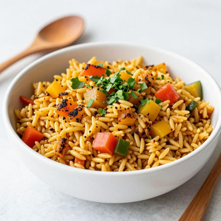 Savory Middle Eastern rice pilaf with toasted orzo, vibrant diced vegetables, and fresh herbs garnished atop, served in a pristine white bowl accompanied by wooden utensils.
