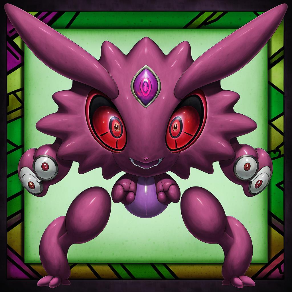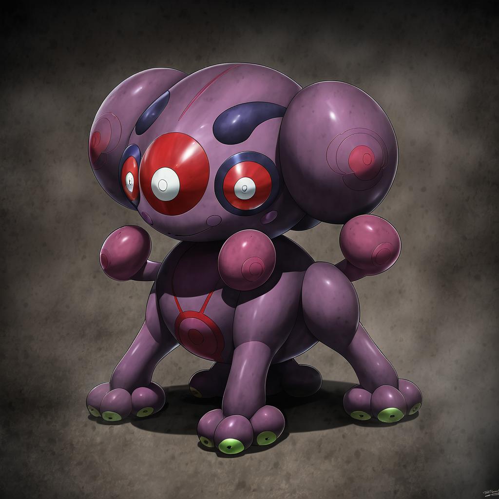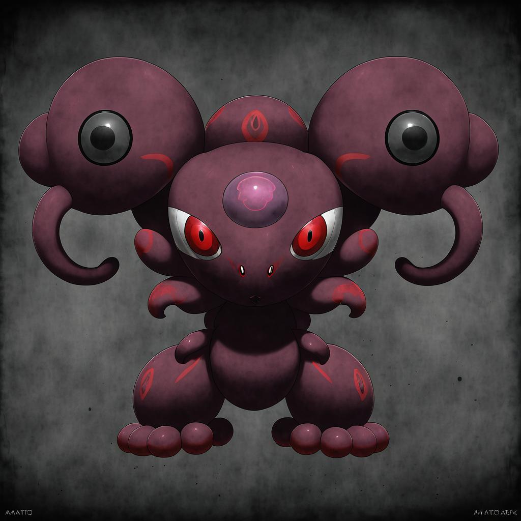 Digital artwork of a Munna-inspired Pokémon creature featuring large round shapes, multiple purple-toned body segments, and intense red eyes. The creature's design showcases anime-style influences with a smooth, shiny texture and detailed shading, emphasizing its animated and fictional characteristics.