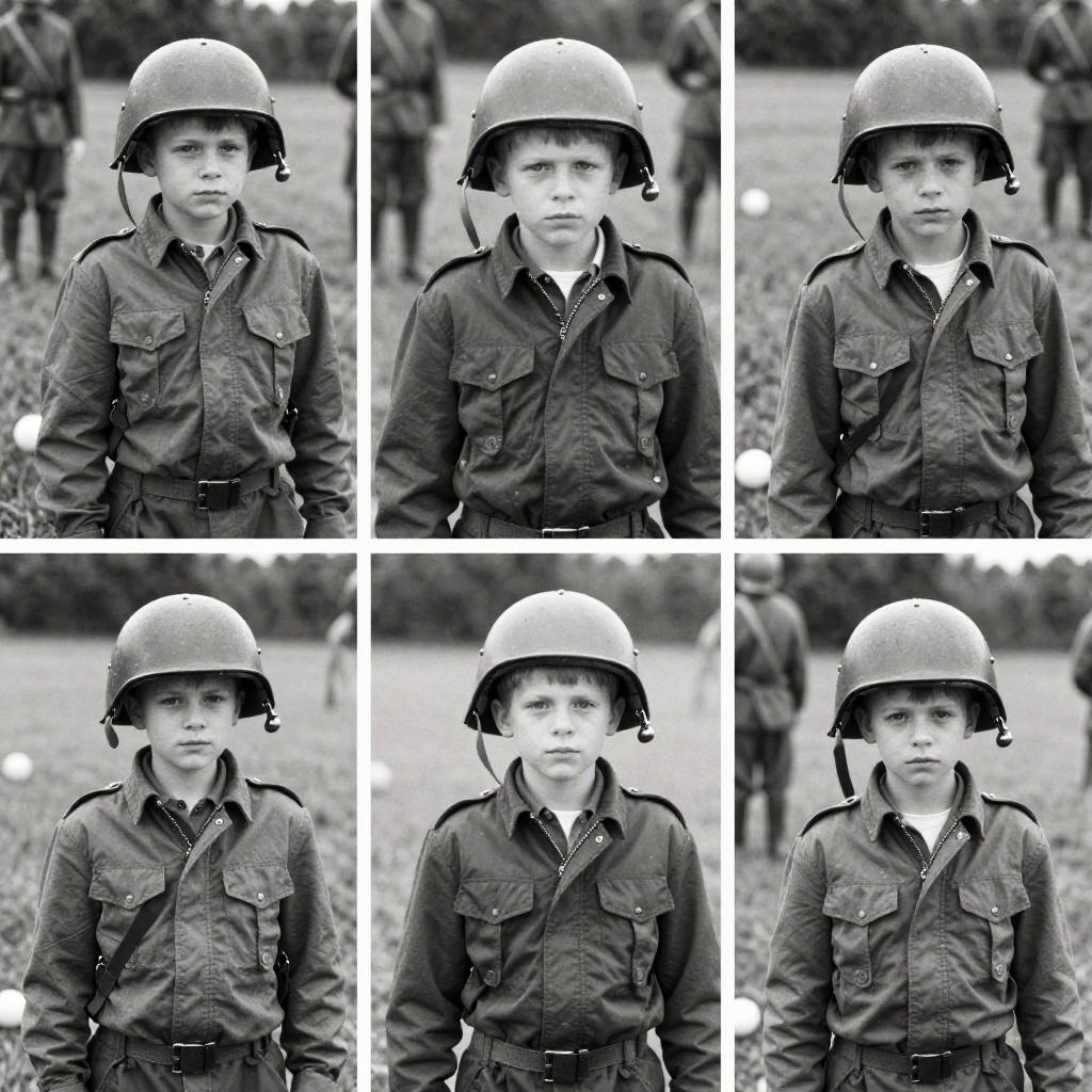 Black-and-white photograph collage of a young boy in a vintage military-style jacket and helmet, standing in a grassy field with scattered balls. The boy has light hair and a serious expression. Each panel shows him from slightly different angles, with blurred background and other figures in helmets. The image has a grainy texture, giving it an old-timey feel.
