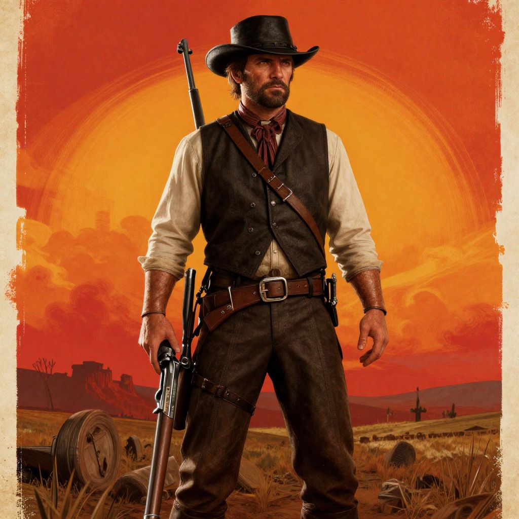 Digital illustration of a rugged, bearded man in a brown cowboy hat, holding a silver revolver, wearing a brown leather jacket over a white shirt,
