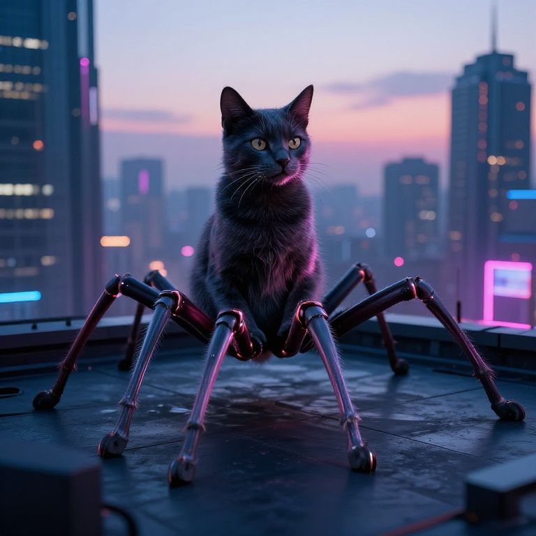 Six legged cat lounging on a futuristic city rooftop at dusk, neon lights reflecting on sleek fur, cyberpunk vibes, sharp focus, detailed environment