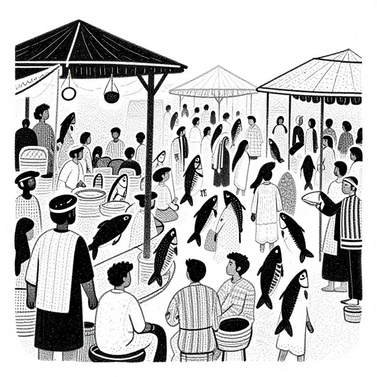 Knitted use a black and white vector style to show Indian traditional fish market getting crowded drawing, black and white, crsp illustration , Adobe illustrator,