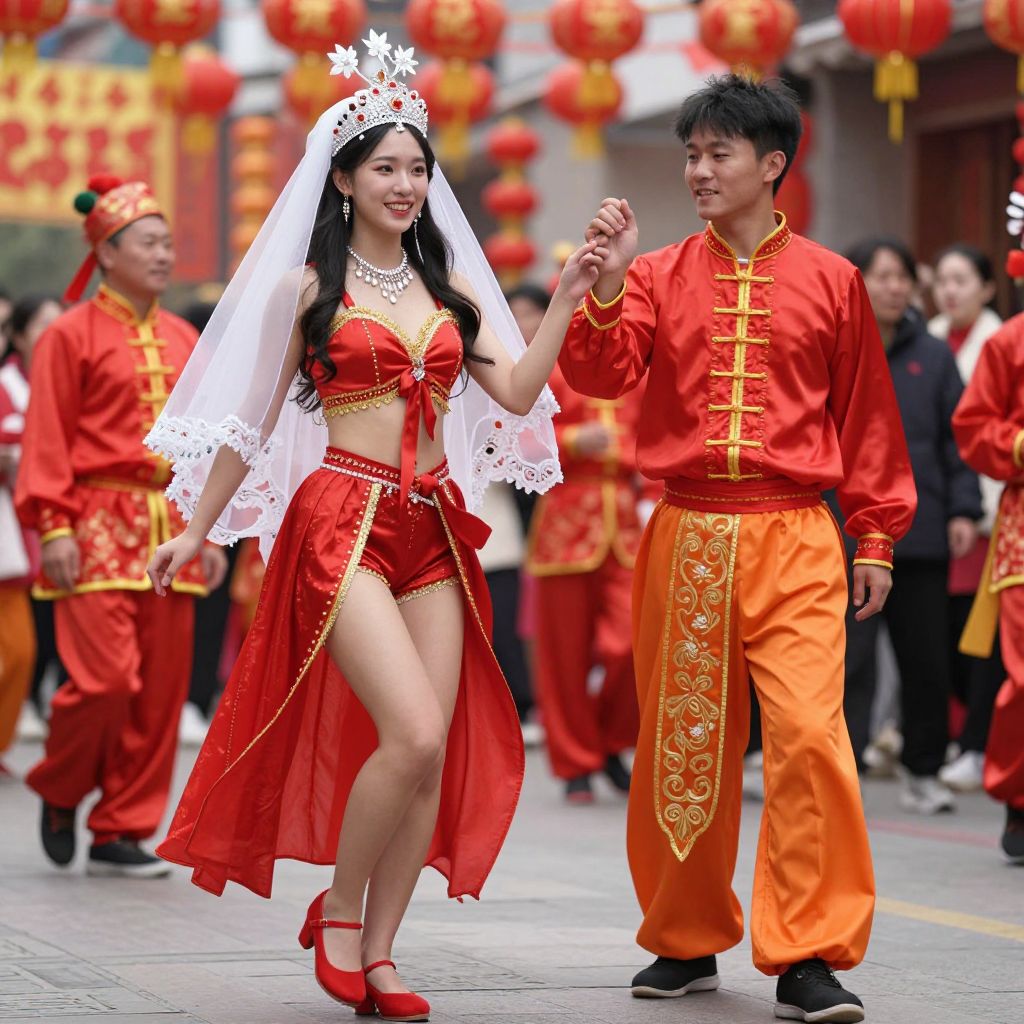 Photograph of a vibrant Chinese cultural parade featuring a young Asian couple. The woman, with long black hair, wears a red satin bra and high-waisted shorts, accented with gold trim, and a white lace veil with a floral crown. She also wears red high heels. The man, with short black hair, wears a red satin jacket with gold buttons and orange satin pants with intricate gold patterns. They are holding hands and smiling. The background shows other parade participants in similar attire, red lanterns, and traditional Chinese architecture. The scene is lively and colorful.
