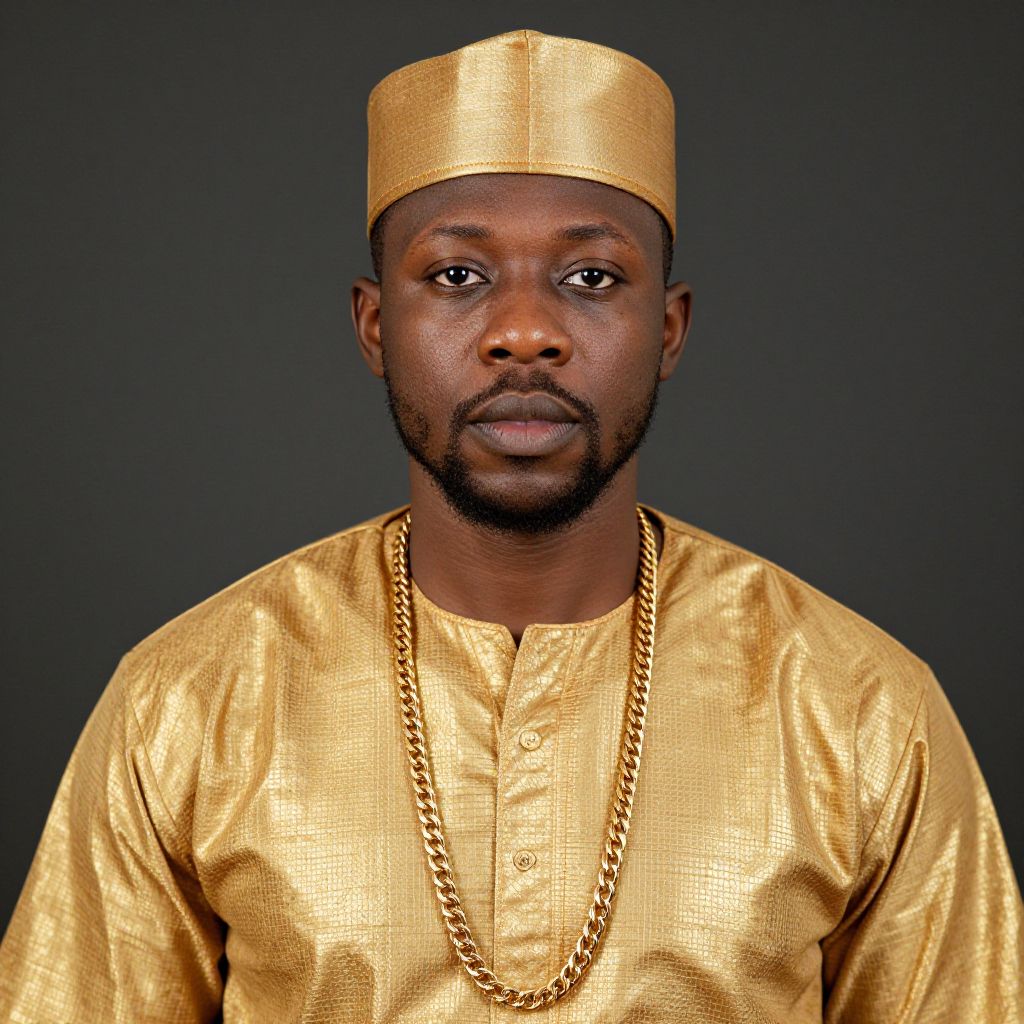 Photograph of a Black man with a medium-dark skin tone, short hair, and a trimmed beard. He's wearing a shiny, gold, textured shirt and a matching gold cap. A thick, gold chain hangs around his neck. He's looking straight at the camera with a neutral expression. The background is a solid, dark gray, making him stand out. The lighting highlights the gold fabric's texture.