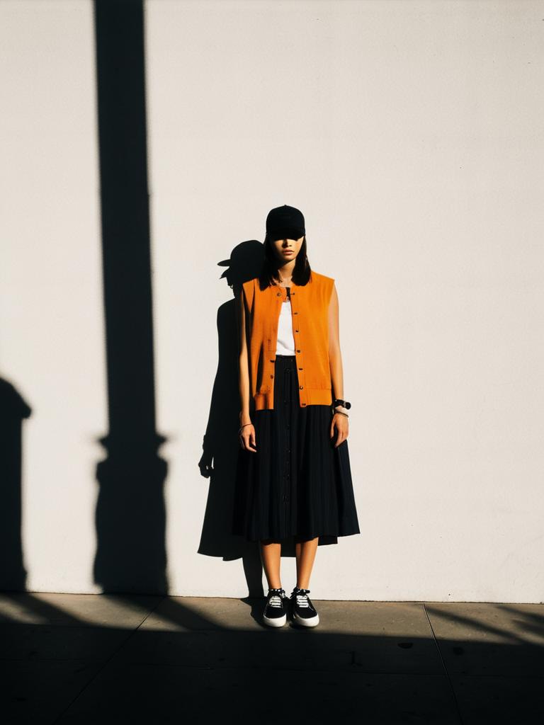 Full-length portrait of an Asian woman wearing a black oversized sweatshirt with small white logo, paired with a bright orange denim mini skirt featuring a front center seam and raw hem. She stands on pavement against a white backdrop with clear shadow contrasts, wearing black socks and white sneakers.