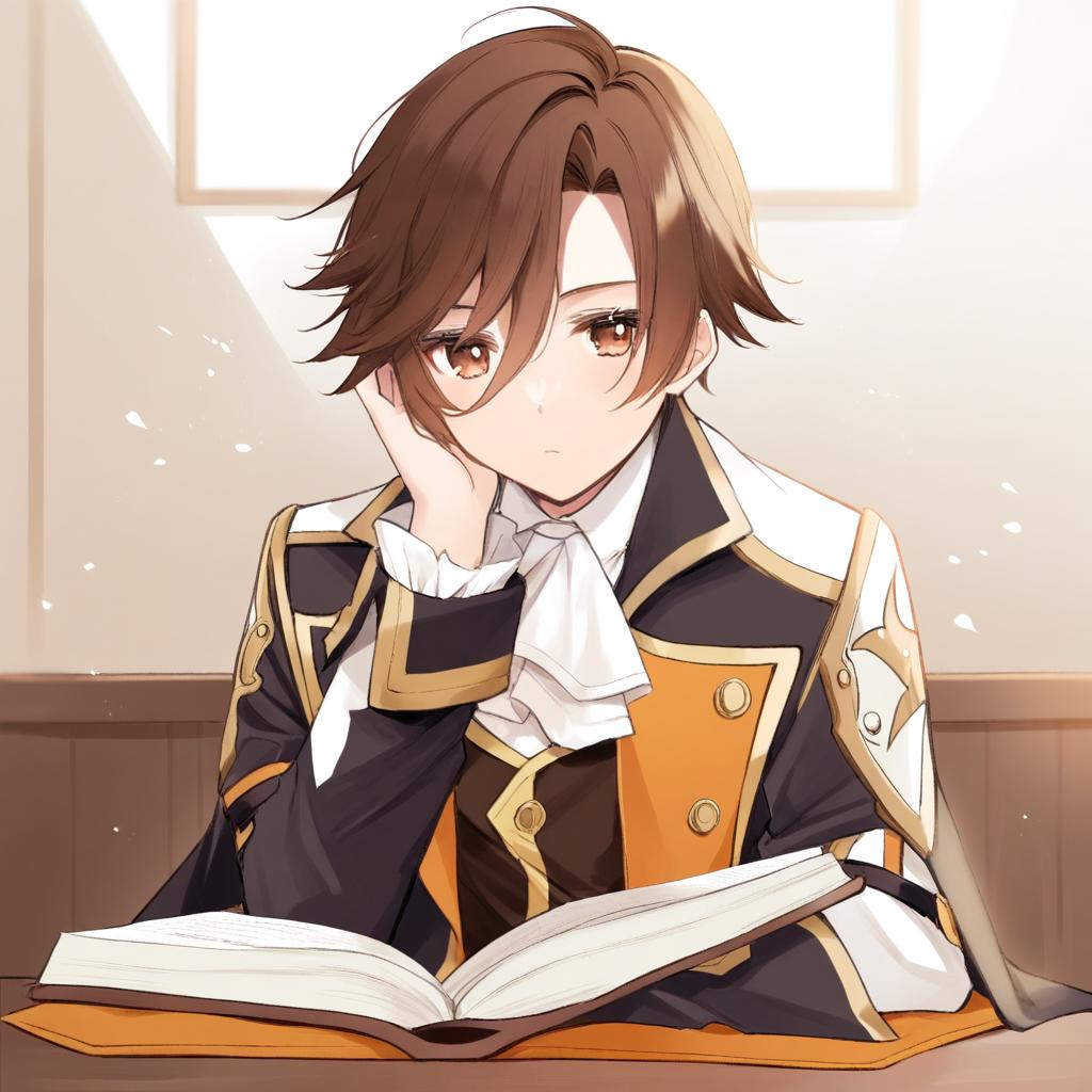 An anime-style illustration of a young brown-haired boy with brown eyes wearing a historical coat with gold and black details, a white ascot, and a ruffled shirt. The boy is sitting at a wooden table, resting his head on one hand, looking thoughtfully at an open book in front of him. The background is softly lit, with a window casting light inside the room.