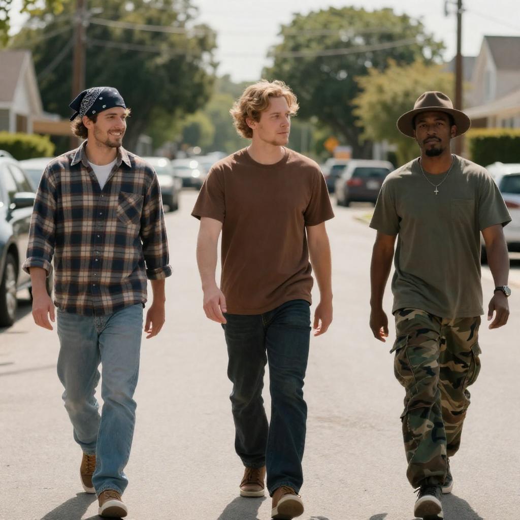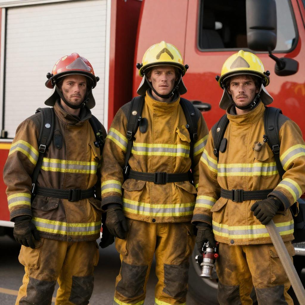 Three firefighters in yellow and black gear, helmets with reflective strips, standing in front of a red fire truck. One firefighter in the center, leaning against the truck, two others on the left and right. Rightmost firefighter holding a hose, intense expression. All have dirty, soot-covered faces and clothes. Bright, warm light from the fire truck.