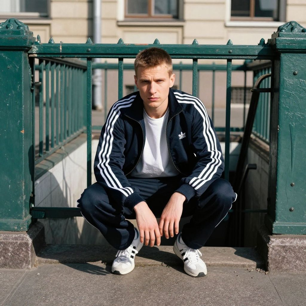 Gopnik outfit, classic 90s post-Soviet street style, Adidas stripes on jacket and pants, squat pose by a subway entrance, strong shadows, realistic urban vibe
