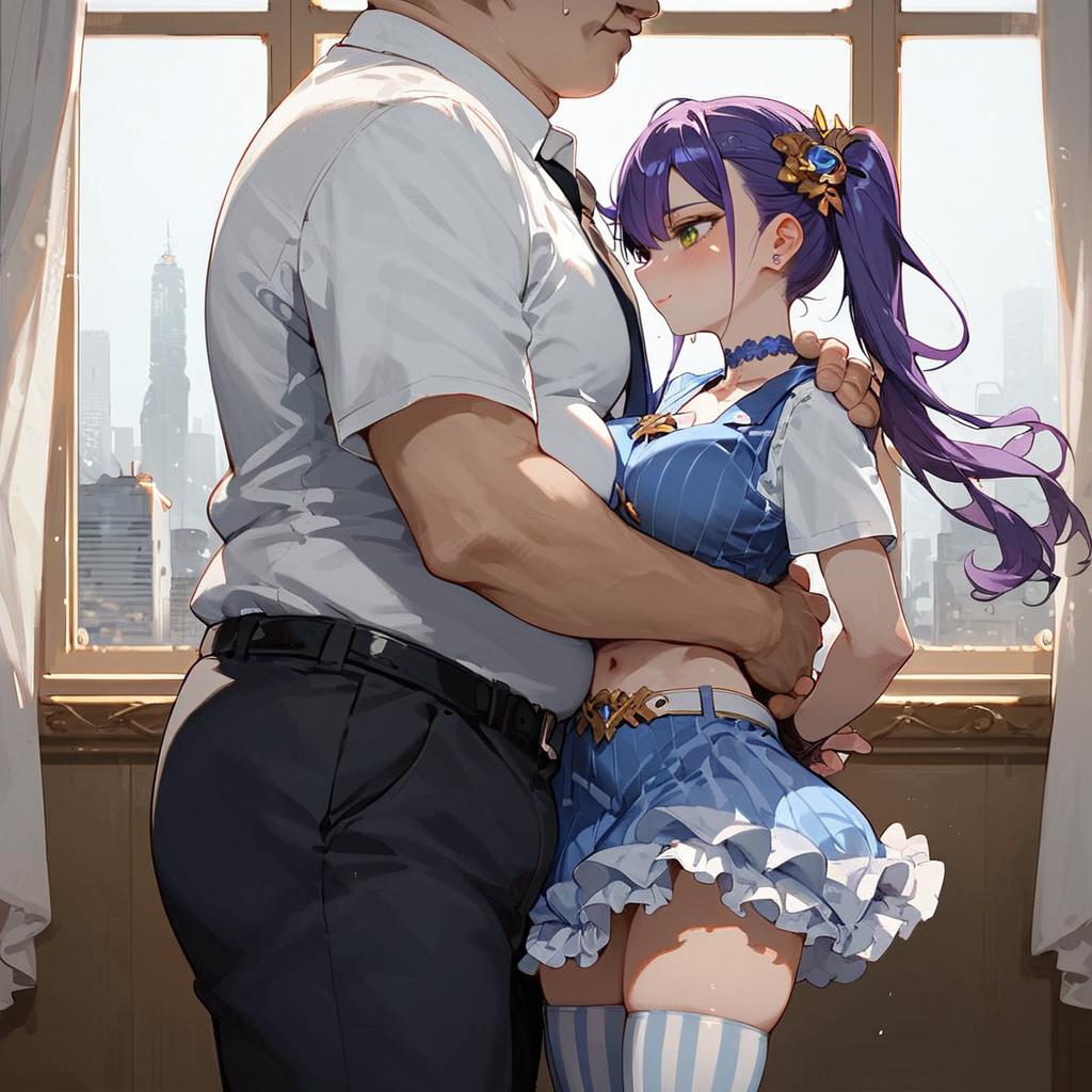Score_9, score_8_up, score_7_up, score_6_up, score_5_up, score_4_up, source_anime, rating_explicit, shion toudou, 1girl, purple hair, long hair, side ponytail, yellow eyes, hair ornament, choker, layered dress, layered skirt, jacket, short sleeves, multicolored clothes, crop top, navel, striped, multicolored skirt, vertical-striped thighhighs, fingerless gloves, asymmetrical legwear, arms behind back, looking at another, looking down, sad, worried, tearing up, standing, shaded face, night, hotel room, window, curtains, cityscape, city lights, skyline 1boy, fat man, mature male, head out of frame, size difference, height difference, business suit, belt, pants, hand on another's shoulder, hug from behind
