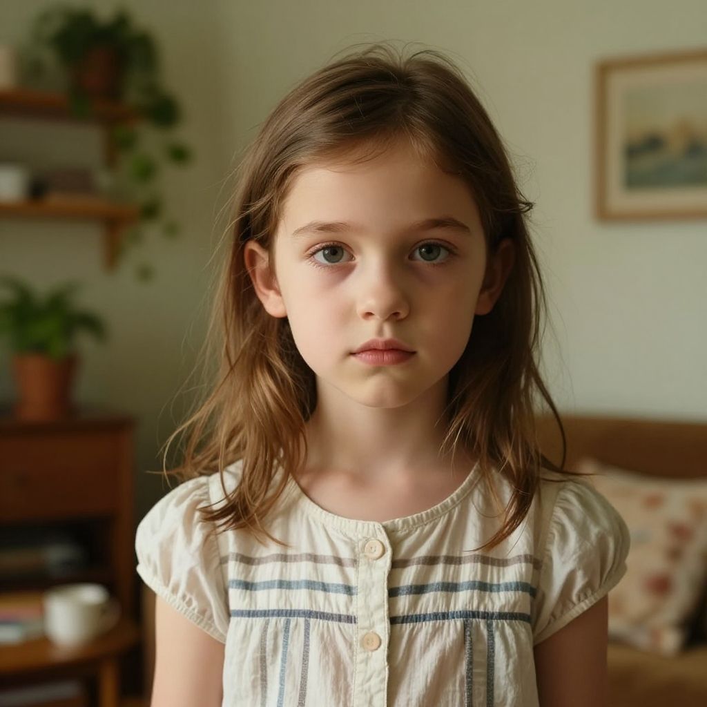 Photograph of a young Caucasian girl with light skin and brown, shoulder-length hair, standing indoors. She has large, dark brown eyes and a neutral expression. She wears a white, short-sleeved blouse with two blue stripes across the chest and a button at the neckline. The background includes a blurred living room with a wooden shelf holding potted plants, a framed picture on the wall, and a cushioned chair with floral upholstery. The lighting is natural, highlighting her face and creating a soft, warm atmosphere. The image has a realistic, slightly enhanced color style.