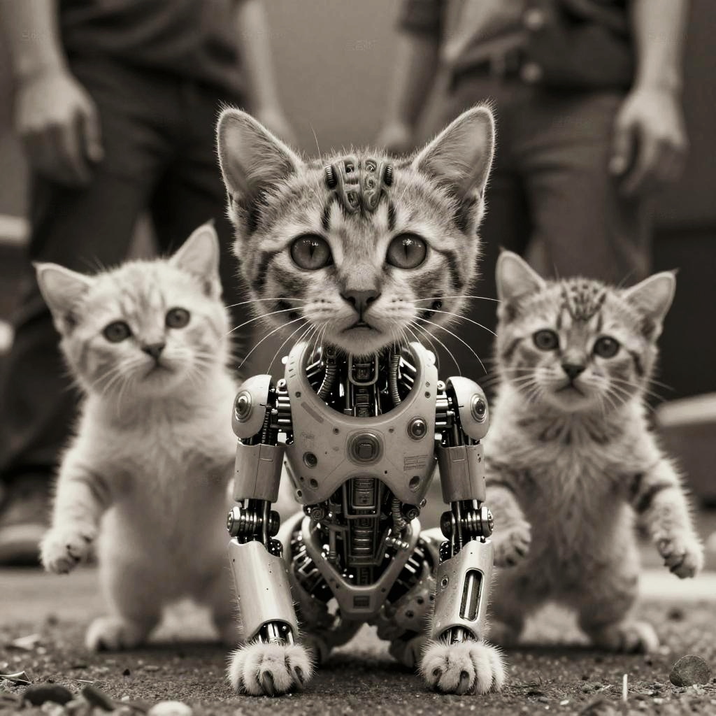 Black and white image featuring a cyberpunk-style cyborg kitten with intricate mechanical details on its body and a natural kitten head. The robotic kitten is flanked by two real kittens in the background. The scene includes human legs blurred in the background, enhancing the focus on the cybernetic kitten and its organic companions.
