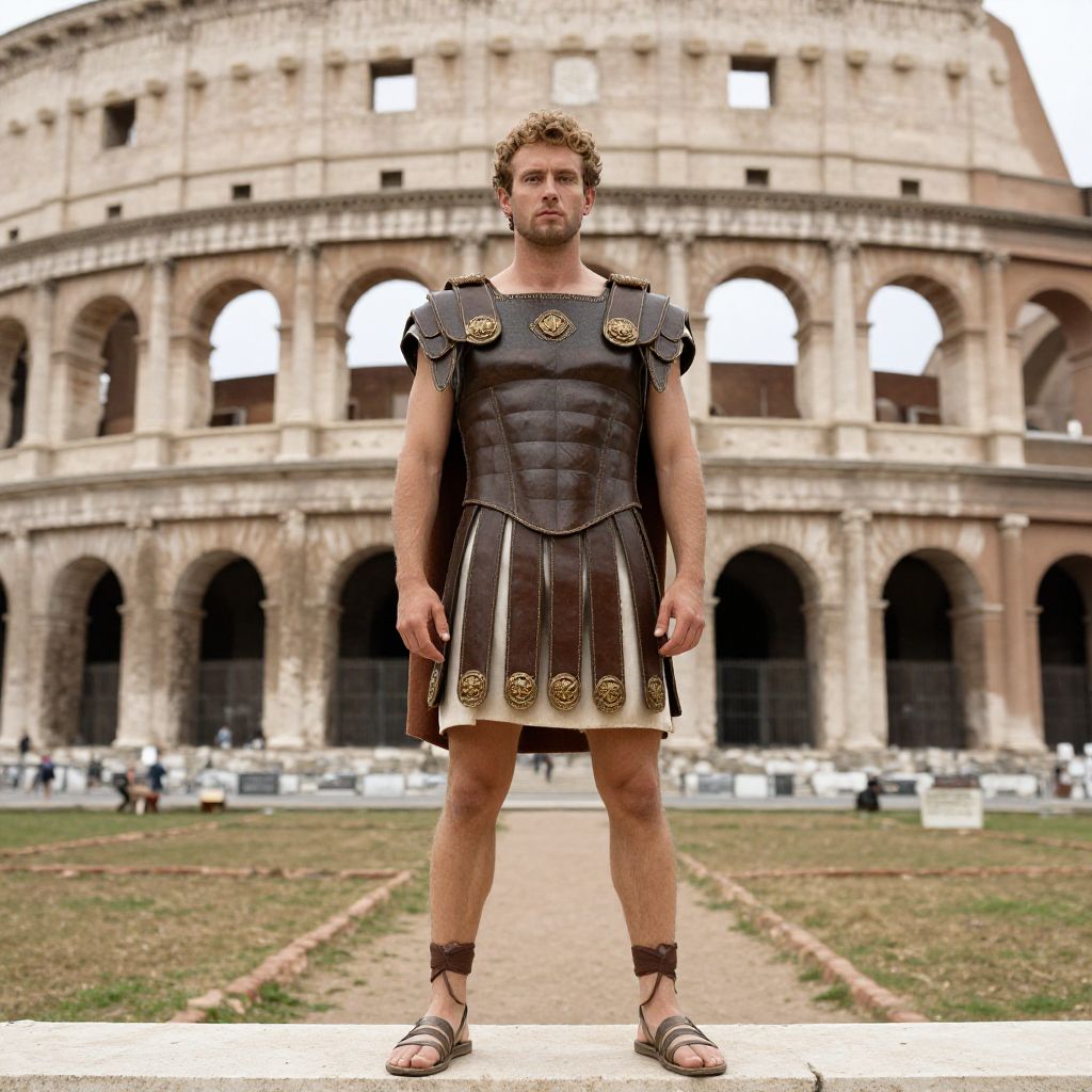 Roman Theater Costume, man dressed in a roman costume standing in front of a building